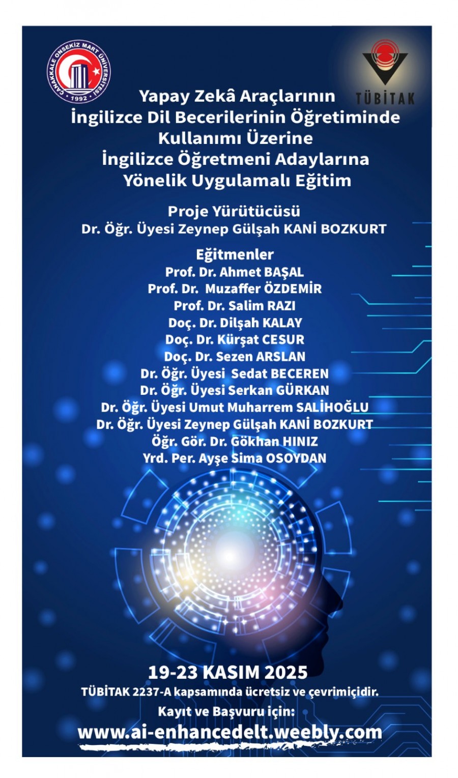 19-23 Kasım 2025 tarihleri arasında, Çanakkale Onsekiz Mart Üniversitesi Yabancı Diller Eğitimi Bölümü İngiliz Dili Eğitimi ABD ev sahipliğinde, proje yürütücülüğünü Anabilim Dalımız Dr. Öğr. Üyesi Zeynep Gülşah KANİ BOZKURT’un yaptığı, TÜBİTAK 2237-A BİDEB destekli “Yapay Zekâ Araçlarının İngilizce Dil Becerilerinin Öğretiminde Kullanımı Üzerine İngilizce Öğretmeni Adaylarına Yönelik Uygulamalı Eğitim” ücretsiz ve çevrimiçi olarak verilecektir. Eğitime Türkiye genelindeki devlet ve vakıf üniversitelerinin 3. ve 4. sınıf İngiliz Dili Eğitimi ABD öğrencilerinden, not ortalaması 3.00/4.00 üzerindeki 50 kişi seçilecektir. Başvuru ve eğitim sürecine ait detaylı bilgilere https://ai-enhancedelt.weebly.com/ adresinden ulaşılabilmektedir.